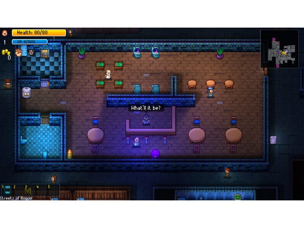 Streets of Rogue je zasazen do procedurální generovaného města, kde obyvatele zevšech společenských vrstev, plní své každodenní činnosti. Za účelem pokroku, hráč bude muset dosáhnout konkrétních cílůmise prostřednictvím použití svých speciálních charakterových rysů a předmětů.