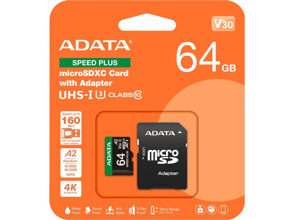 Paměťová karta microSDXC SPEED PLUS má maximální přenosovou rychlost 160 MB/s a je vhodná pro drony, akční kamery a další zařízení. Vyhovuje standardům V30, A2 a dalším, podporuje nahrávání ve vysokém rozlišení a multitasking a je nejlepší volbou pro dobrodruhy.