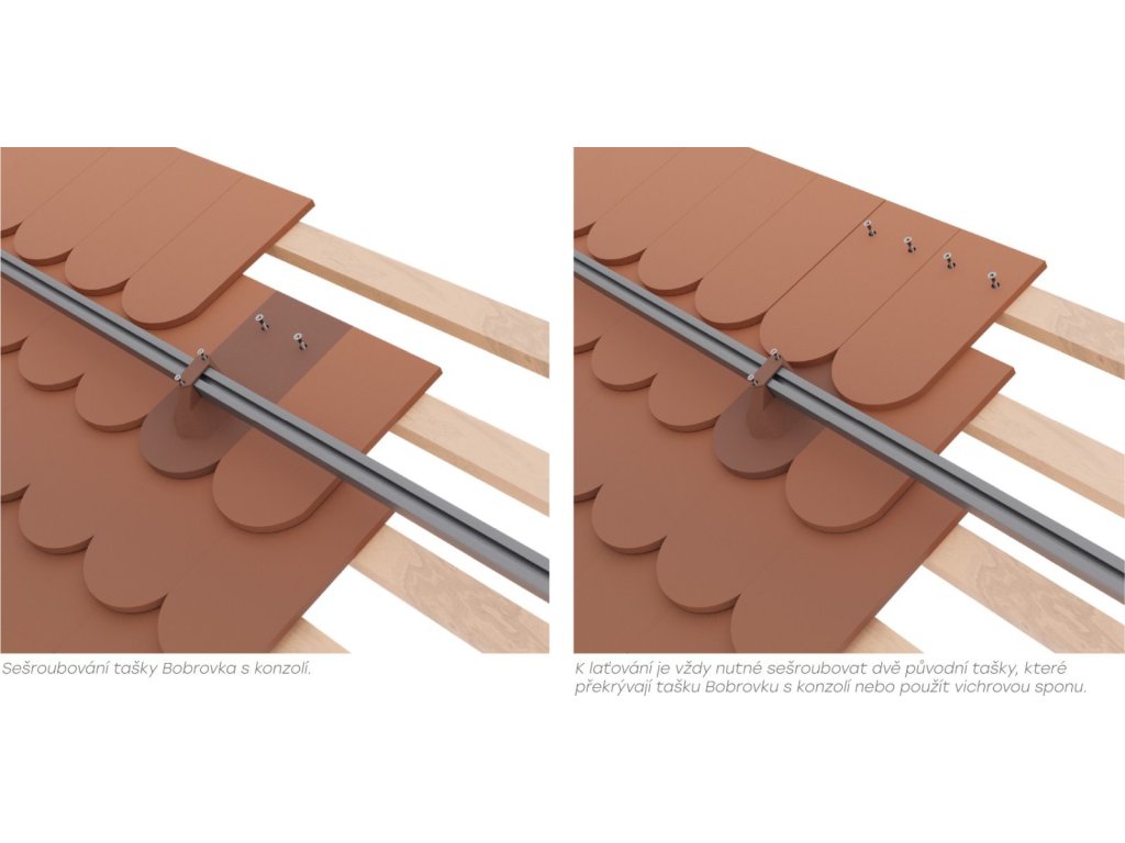 Akusolar střešní tašky typu bobrovka s integrovanou konzolou představuje špičkové řešení pro jednoduchou a šetrnou instalaci fotovoltaiky. Díky možnosti výměny tašek kus za kus není nutné vybrušování původních střešních krytin, což zachovává estetický vzhled střechy. Konzola umožňuje snadné uchycení konstrukce kompatibilní s profily 40 × 40 mm a 40 × 45 mm. Střešní tašky v cihlové barvě (RAL 8023) ladí s tradičním vzhledem bobrovek, a proto jsou ideální volbou pro elegantní i funkční integraci FVE systémů na šikmé střechy.