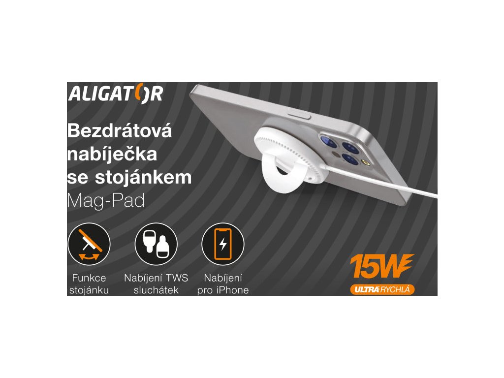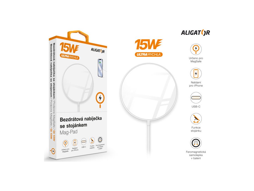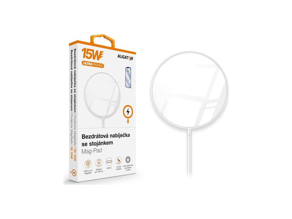 Kompaktní zpracování v elegantní bílé barvě se zářivě lesklým povrchem, praktickým stojánkem a 1m dlouhým přívodním USB-C kabelem, to je bezdrátová nabíječka Aligator Mag-Pad. Součástí balení je také feromagnetická samolepka, díky které můžete rozšířit kompatibilitu u pouzder, které tuto technologii nepodporují.