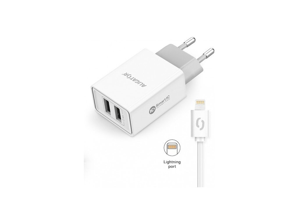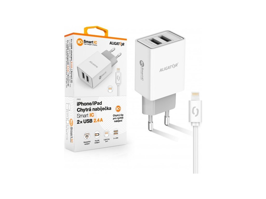 ALIGATOR Chytrá síťová nabíječka 2,4A, 2xUSB, smart IC, bílá, USB kabel pro iPhone/iPad
