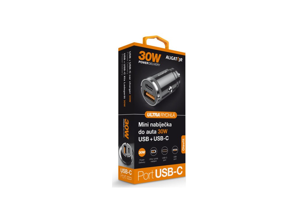 Chytrá mini nabíječka do auta ALIGATOR Power Delivery 30W, USB-C + USB-A