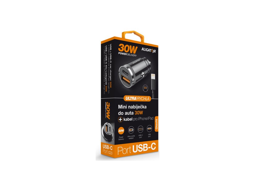 Aligator mini nabíječka do auta Power Delivery 30W,USB-C + USB-A, USB-C kabel pro iPhone/iPad
