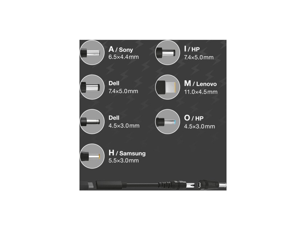 Tento adaptér je ideálním pomocníkem pro dobíjení velké části notebooků a ultrabooků. Pečlivě jsme si dali záležet při výběru typů konektorů. Vyberte si jeden ze 7 přiložených konektorů (koncovek), který bude vhodný pro nabíjení Vašeho zařízení.