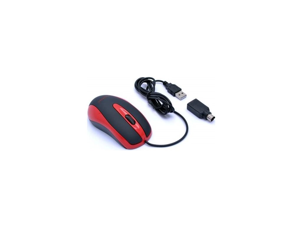 Luxusní červeno-černá 3-tlačíková myš s velmi přesným rozlišením 800dpi a s rolovacím tlačítkem. Rozhraní USB 1.1 (kompatibilní s USB 2.0) a redukce z USB na PS/2 konektor. Universální pro praváky i leváky. Velmi příjemná struktura na dotyk. Pěkné retailové blisterové balení.