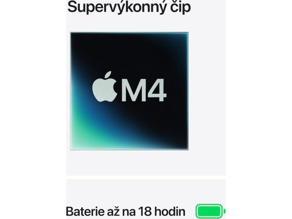 Procesor: Apple M4, 10 jádrové CPU (4P+6E), 10 jádrové GPU, 16 jádrový Neural Engine, propustnost 120GB/s