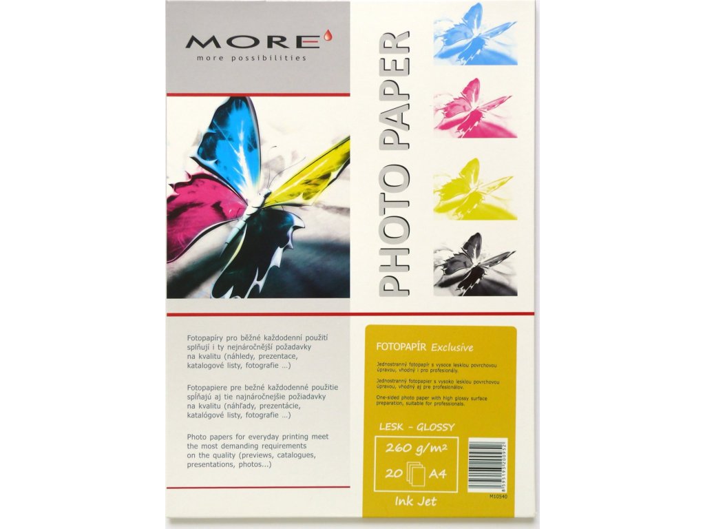 ARMOR Fotopapír MORE Exclusive je předurčen pro kvalitní i ten nejnáročnější tisk fotografií v inkoustových tiskárnách. Jedná se o jednostranně potahovaný fotopapír s vysoce lesklou povrchovou úpravou, díky které mají fotografie vždy vysoký kontrast při zachování přirozených barev.