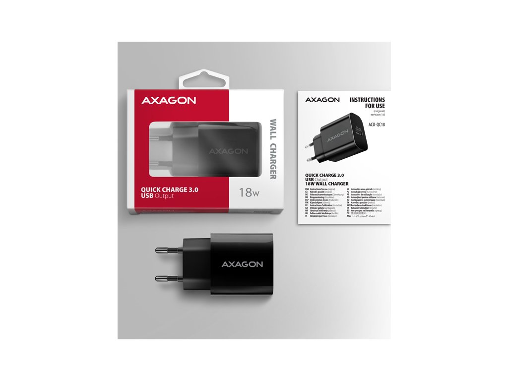 AXAGON ACU-QC18, nabíječka do sítě 18W, 1x port USB-A, QC3.0/AFC/Apple, černá