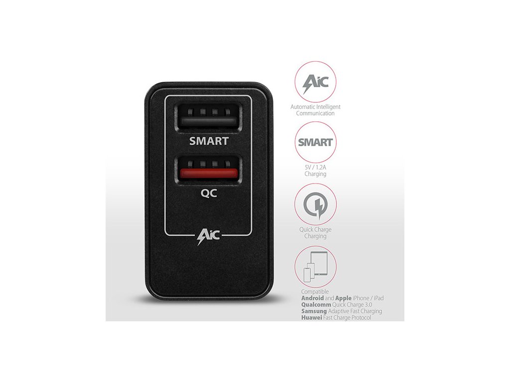 Funkce AIC rozpozná připojené zařízení a automaticky zvolí optimální rychlost nabíjení, funkce CC zajistí stabilní průběh nabíjení.
