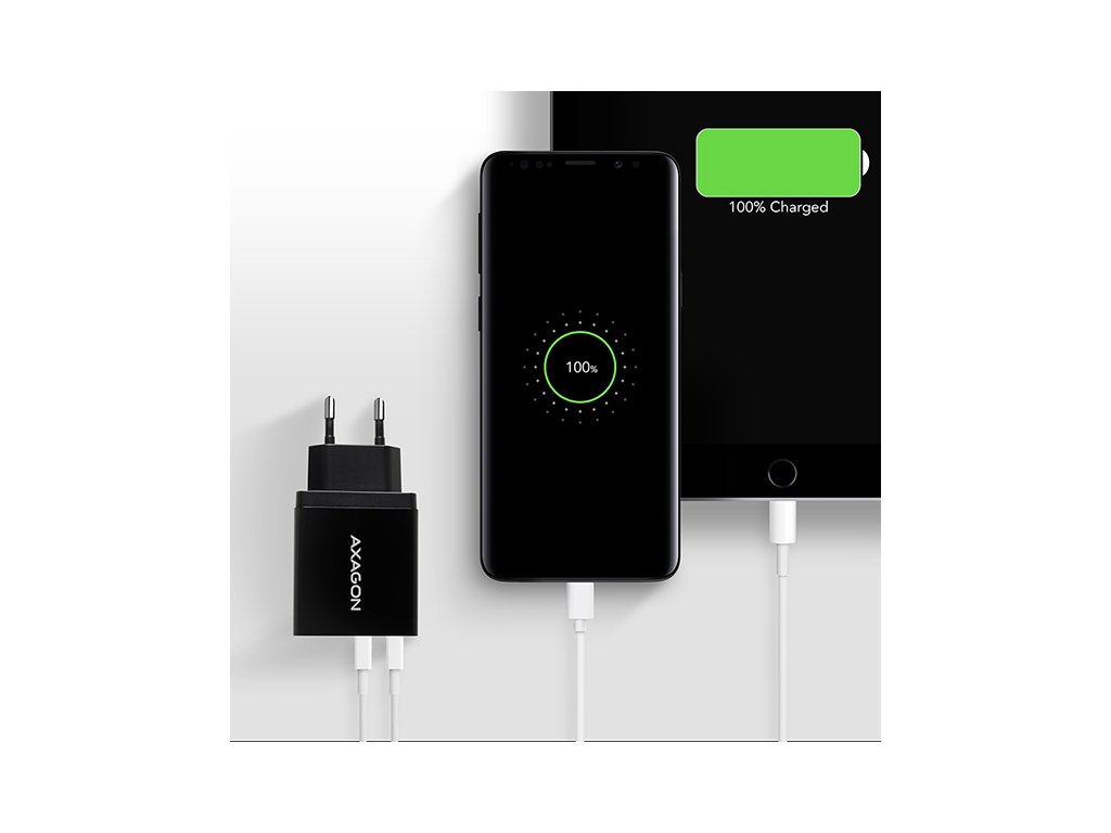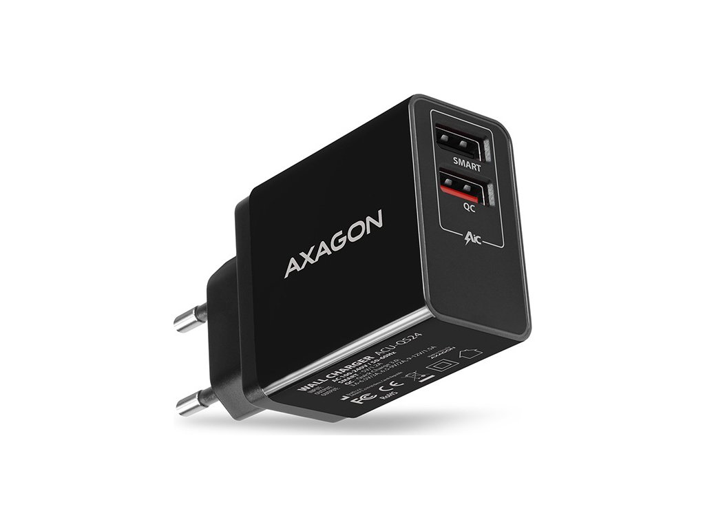 Univerzální USB nabíječka do sítě AXAGON ACU-QS24 pro rychlé nabíjení až dvou mobilních zařízení současně.