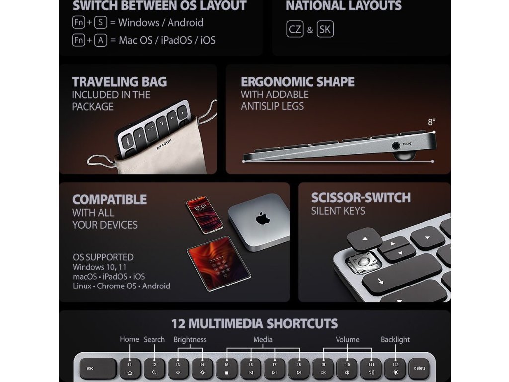 • Přepínání mezi OS: fn+S pro Windows / Android, fn+A pro macOS / iPadOS / iOS.