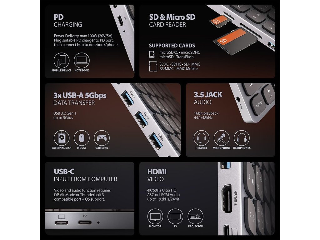 AXAGON HMC-KB-CS KEYBOARD hub promění Váš telefon, tablet nebo mini notebook na plnohodnotné počítačové pracoviště. Vaše mobilní zařízení připojíte k dokovací stanici 9in1 přes dodaný 60 cm dlouhý kabel. V okamžiku tak máte k dispozici integrovanou klávesnici, čtečku SD i microSD karet a konektory pro připojení externího monitoru, tří USB zařízení, sluchátek nebo headsetu a Power Delivery napájení. Je však nutné, aby USB-C port vašeho mobilního zařízení podporoval video výstup (DisplayPort Alternate Mode) a Power Delivery napájení.