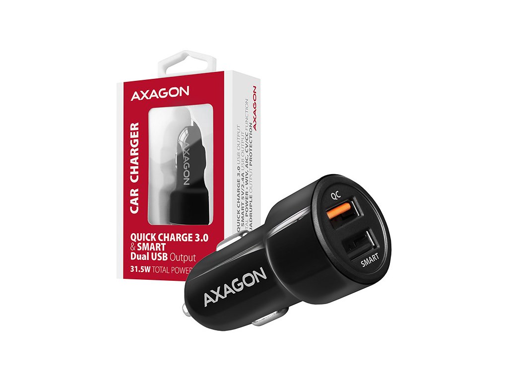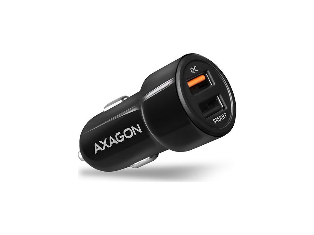 Univerzální USB auto nabíječka AXAGON PWC-QC5 pro rychlé nabíjení až dvou mobilních zařízení současně.