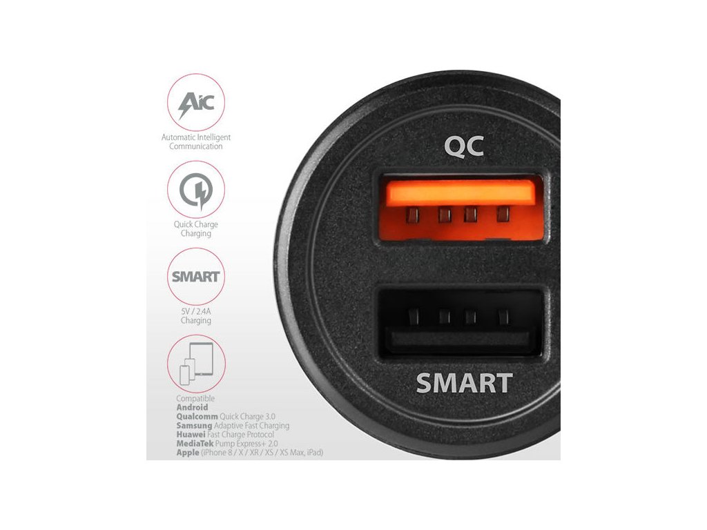 • Smart 5V/2.4A nabíjení, Qualcomm Quick Charge 1.0, USB Battery Charging 1.2 a rychlé nabíjení Apple iPhone 8, X, XR, XS, XS Max a iPadů.