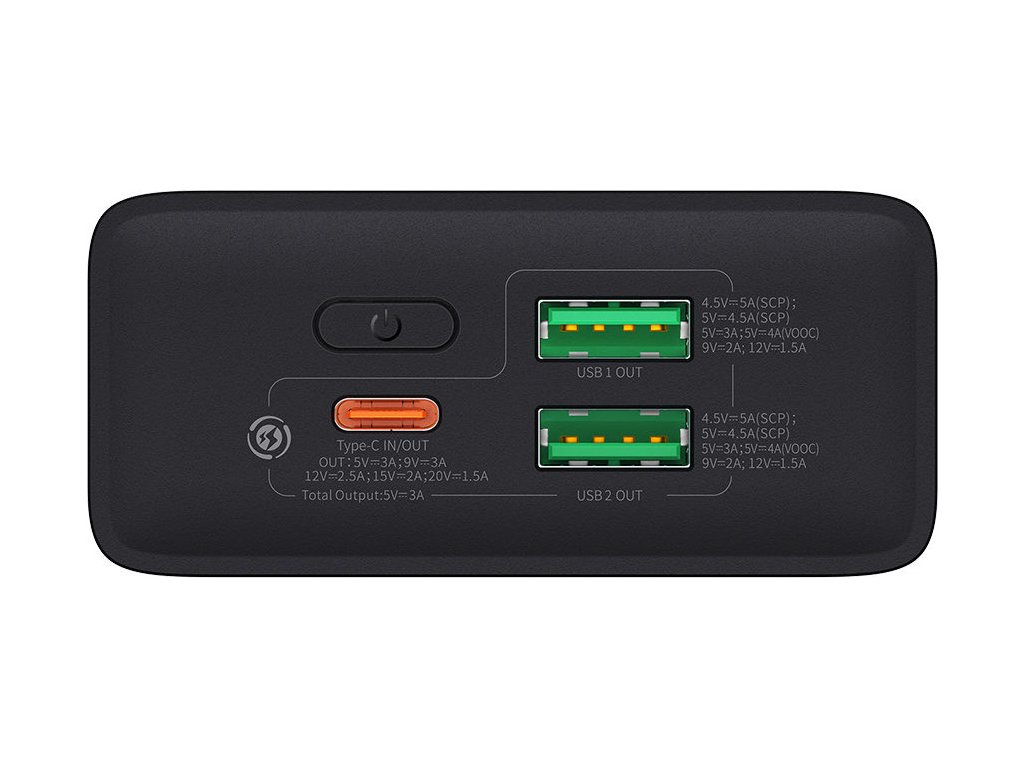 * 2x USB-A: 4,5V/5A (SCP); 5V/4,5A (SCP); 5V/3A; 5V/4A (VOOC); 9V/2A; 12V/1,5A (výstup)