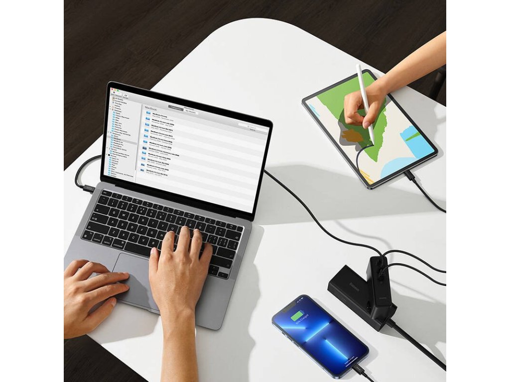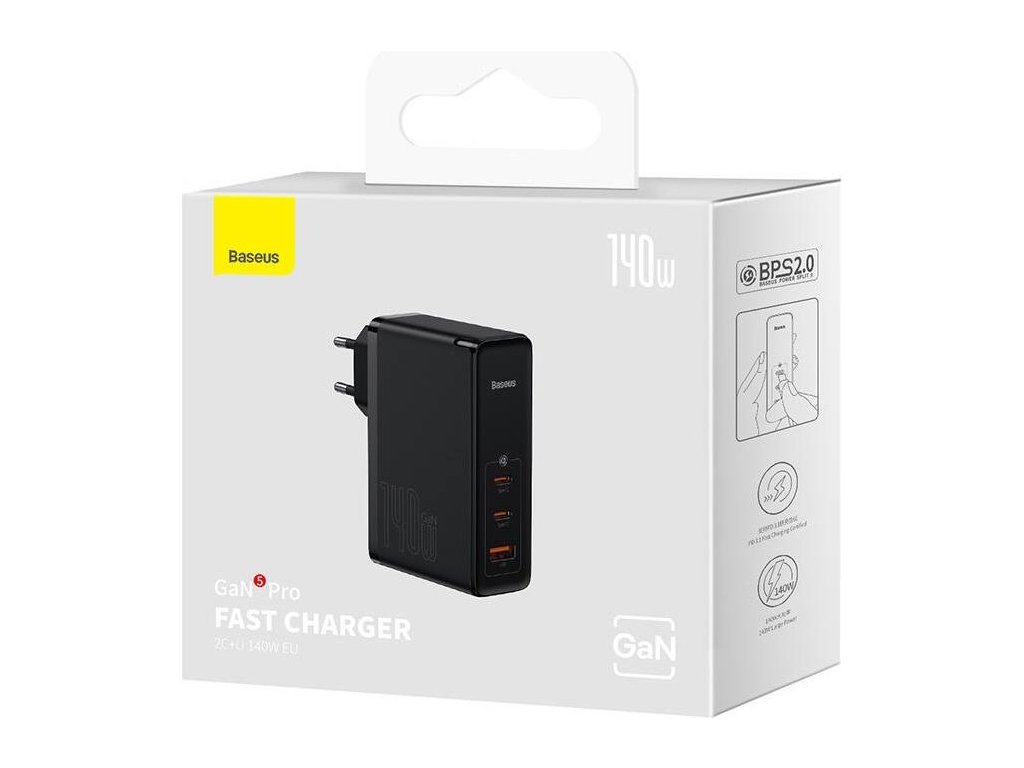 Baseus GaN5 Pro Wall Charger 2xUSB-C + USB 140W EU Black - velmi výkonná sítová nabíjecka s výkonem až 140W pri zachování velmi kompaktních rozmeru. Je vybavena konektory 2x USB-C a 1x USB-A, podporuje nabíjecí protokoly USB Power Delivery 3.1, Quick Charge i PPS. Ideální pro moderní výkonné notebooky, tablety, smartphony a další. Díky technologii GaN je menší o 25% a lehcí o 30% než standardní 140W adaptér od Applu, který má jen jeden konektor.