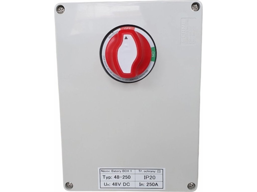 Bateriový box slouží pro bezpečné připojení věžového bateriového uložiště (battery stacku) a 1 měniče v napěťové hladině 48 V DC. Box je vybaven pojistkou 250 A pro připojení plusového vodiče (minimálně o průřezu 70 mm2) battery stacku. Výstup je osazen odpojovačem. Box je dobře připraven na instalaci přívodního i odchozího kabelu díky dvojici otvorů o průměru 40 mm na spodní straně.