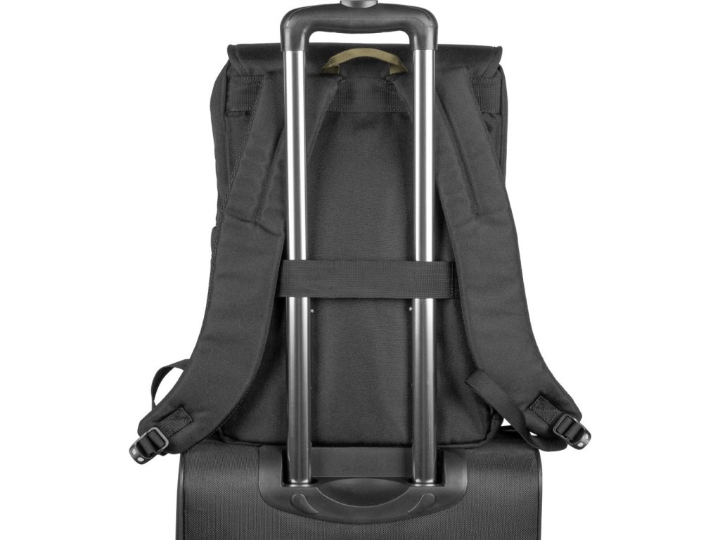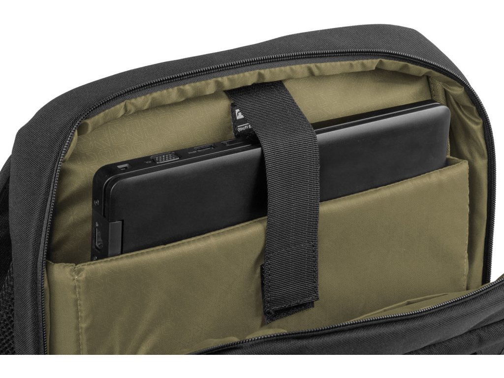 - Hlavní prostor obsahuje měkce polstrovanou, zasouvací kapsu na notebook se zapínáním na suchý zip a dvě menší kapsy na příslušenství.