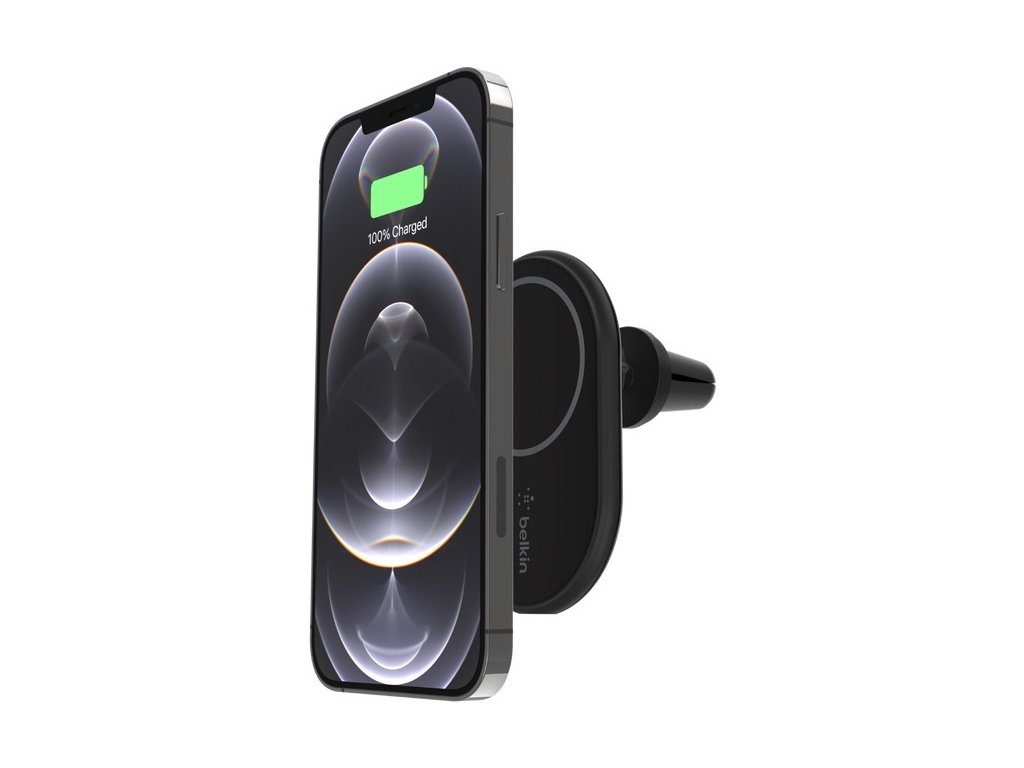 Belkin Boost Charge držák do mřížky ventilace s 10W MagSafe nabíjením pro iPhone. Snadné umístění telefonu jednou rukou a stabilní uchycení i na v nerovném terénu.