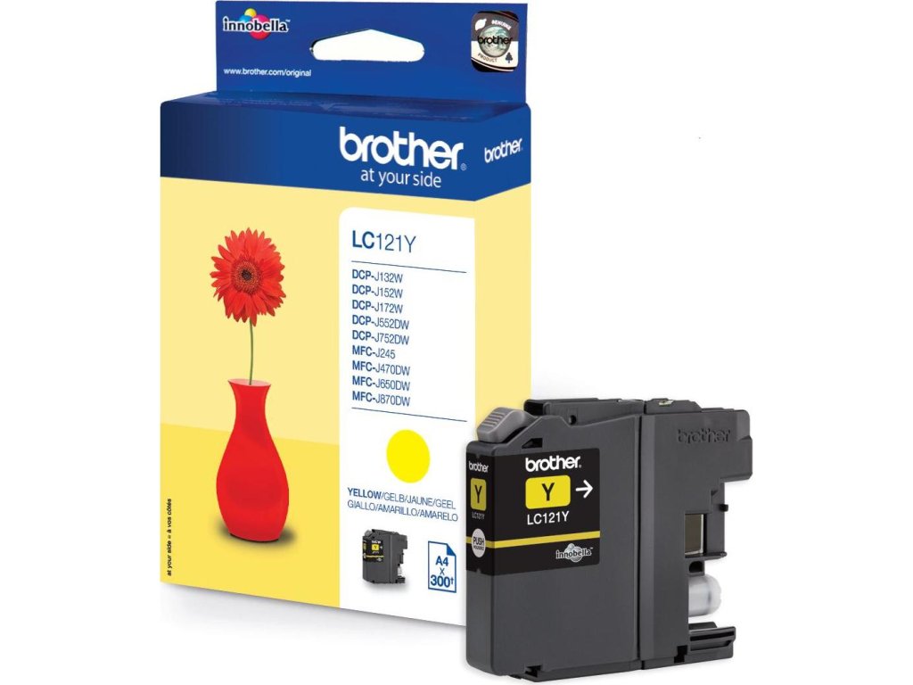 LC121y je žlutá tisková kazeta pro inkoustové tiskárny Brother s označením DCP-J132W/ DCP-J152W/ DCP-J172W/ DCP-J552DW/ DCP-J752DW/ MFC-J245/ MFC-J470DW/ MFC-J650DW/ MFC-J870DW. Pro tento inkoust se udává výtěžnost až 300 stránek při 5 % standardním pokrytí.