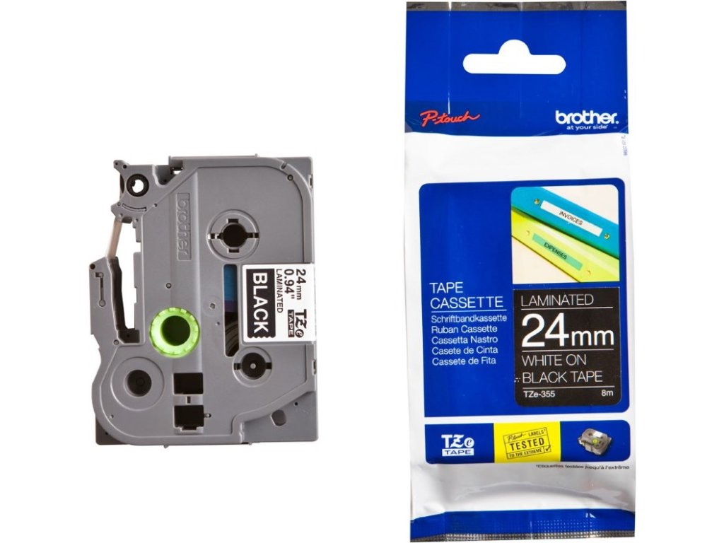 Originální kazeta s páskou Brother TZe-355 - bílý tisk na černé, šířka 24 mm