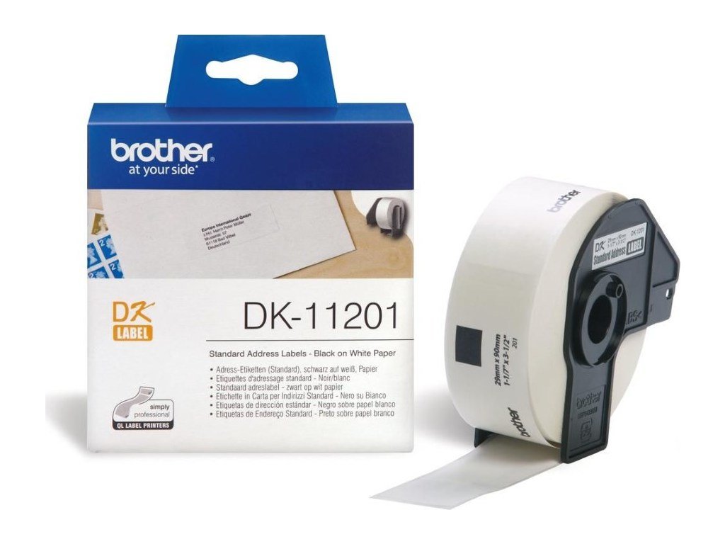 Tyto originální štítky Brother DK-11201 (černá na bílé) jsou užitečné pro širokou škálu vašich obecných požadavků na štítky. Pro použití v domácím i kancelářském prostředí mohou být tyto přednastavené standardní adresní štítky použity k tisku log, čárových kódů, vizitek návštěvníků nebo informací o přepravě.