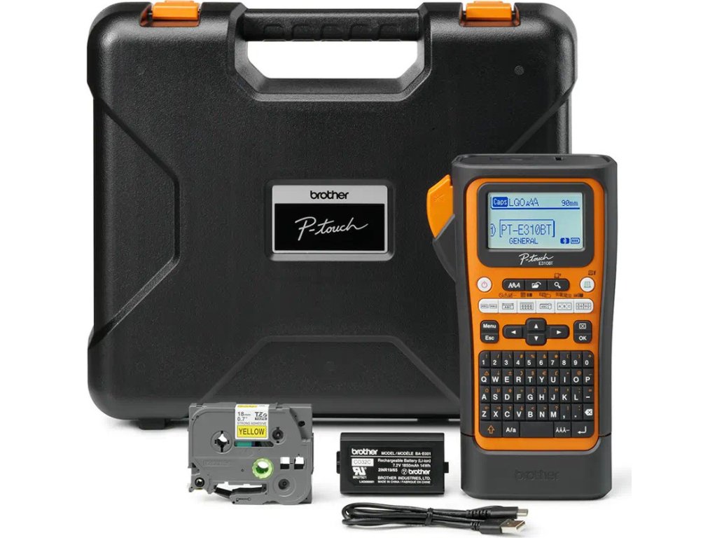 Obsah balení: Tiskárna štítků PT-E310BT, Li-Ion dobíjecí akumulátor, USB kabel type C (1m, černý), 1x 18 mm extrémně přilnavá páska s černým tiskem na žlutém podkladu, dokumentace, pouzdro