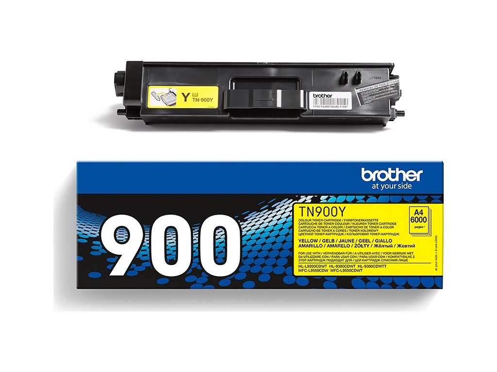 Originální žlutá tonerová cartridge společnosti Brother s označením TN900Y určená pro použití v laserovém zařízení tohoto výrobce MFC-L9550CDWT a HL-L9200CDWT.