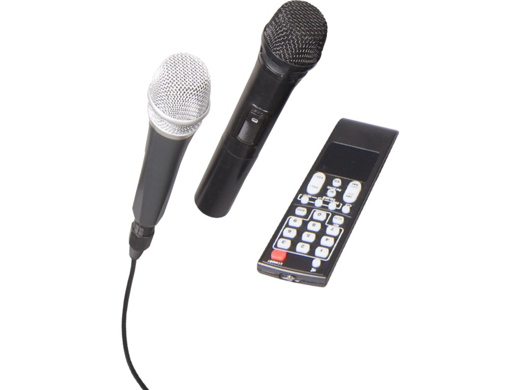 * V balení najdete - drátový i bezdrátový mikrofon, dálkový ovladač a napájecí kabel