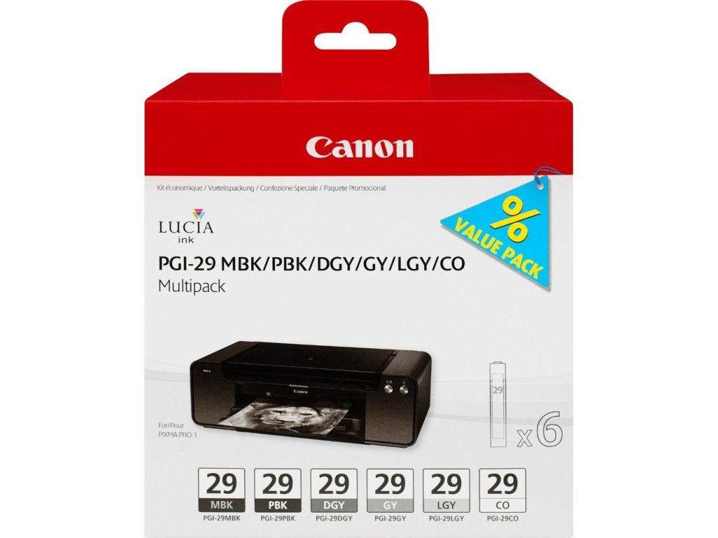 Canon PGI-29 Multipack je praktické balení inkoustových náplní, které obsahuje barvy matnou černou, fotograficko černou, šedou, světle šedou, tmavě šedou a chroma optimizer. Tyto náplně jsou určené pro inkoustovou tiskárnu Canon Pixma Pro-1.