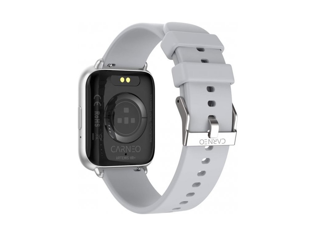 Moderní fitness hodinky Carneo Artemis HR+ v elegantním stříbrném provedení disponují AMOLED displejem, který lze aktivovat pouhým otočením ruky. Umožňují měření krevního tlaku, okysličení krve, srdečního tepu, ujeté vzdálenosti, monitorování spálených kalorií či kvality spánku. Jejich součástí je 250 mAh baterie s výdrží cca 2-3 dní. Podle certifikace IP67 jsou odolné vůči vodě a prachu. Hodinky s podporou technologie Bluetooth jsou kompatibilní s operačním systémem iOS a Android. Silikonový náramek je příjemný na dotek a zaručuje komfort po celý den.
