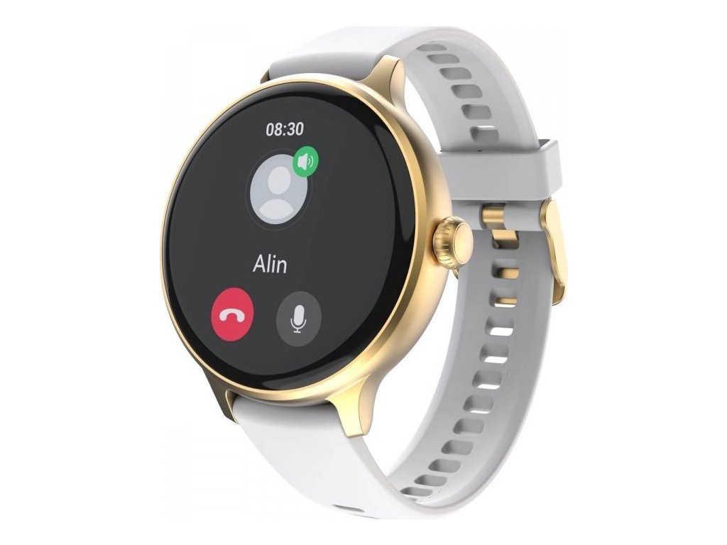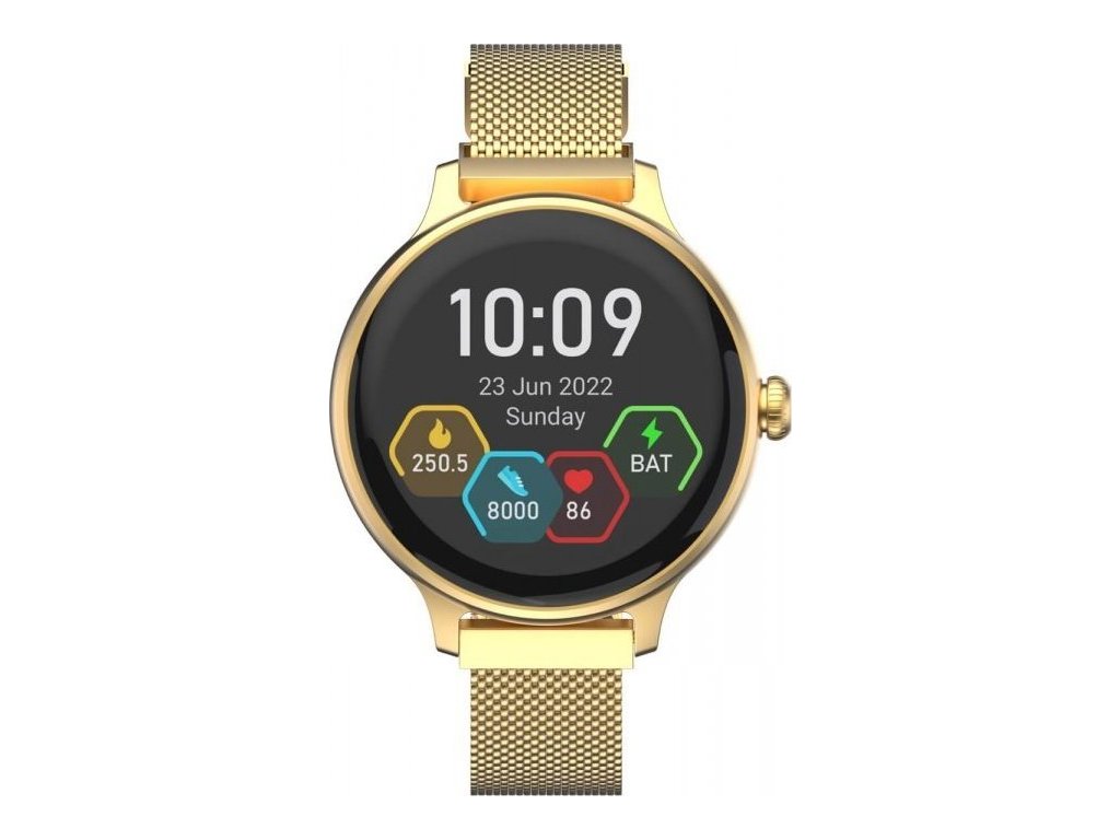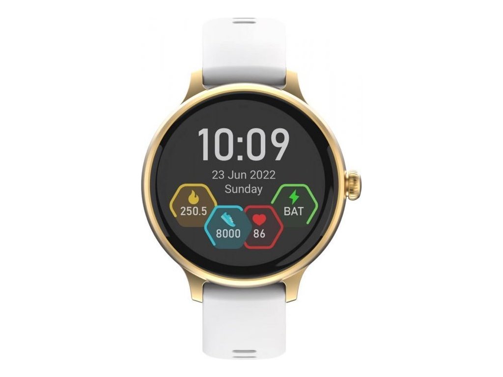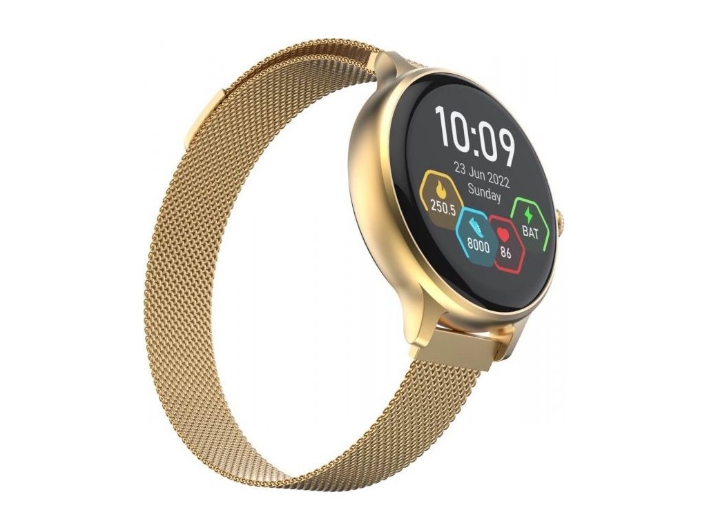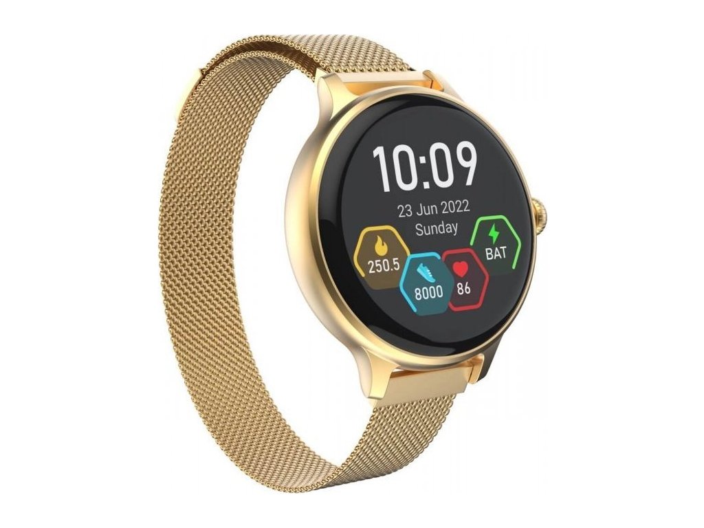 Moderní fitness smart hodinky Carneo HERO mini HR+ v elegantním zlatém provedení disponují kulatým Super HD AMOLED barevným displejem. Umožňují měření srdečního tepu, stresu, BMI, ušlé vzdálenosti, monitorování spálených kalorií či kvality spánku. Jejich součástí je 230mAh baterie s výdrží 3 až 4 dny. Podle certifikace IP67 jsou odolné vůči vodě a prachu. Jsou kompatibilní s operačním systémem iOS a Android. Hodinky mají luxusní Milánský, kovový řemínek v ryze zlaté barvě, který lze vyměnit za silikonový řemínek v jiné barvě či kožený a tím pádem změnit hodinkám manažerský vzhled za sportovní. Vkusný, jednoduchý a luxusní design se snadno kombinuje k obleku či volnočasovému outfitu. Hodinky i aplikace jsou kompletně v češtině, takže si budete jistě spolu dobře rozumět. Součástí balení je také silikonový, bílý řemínek.