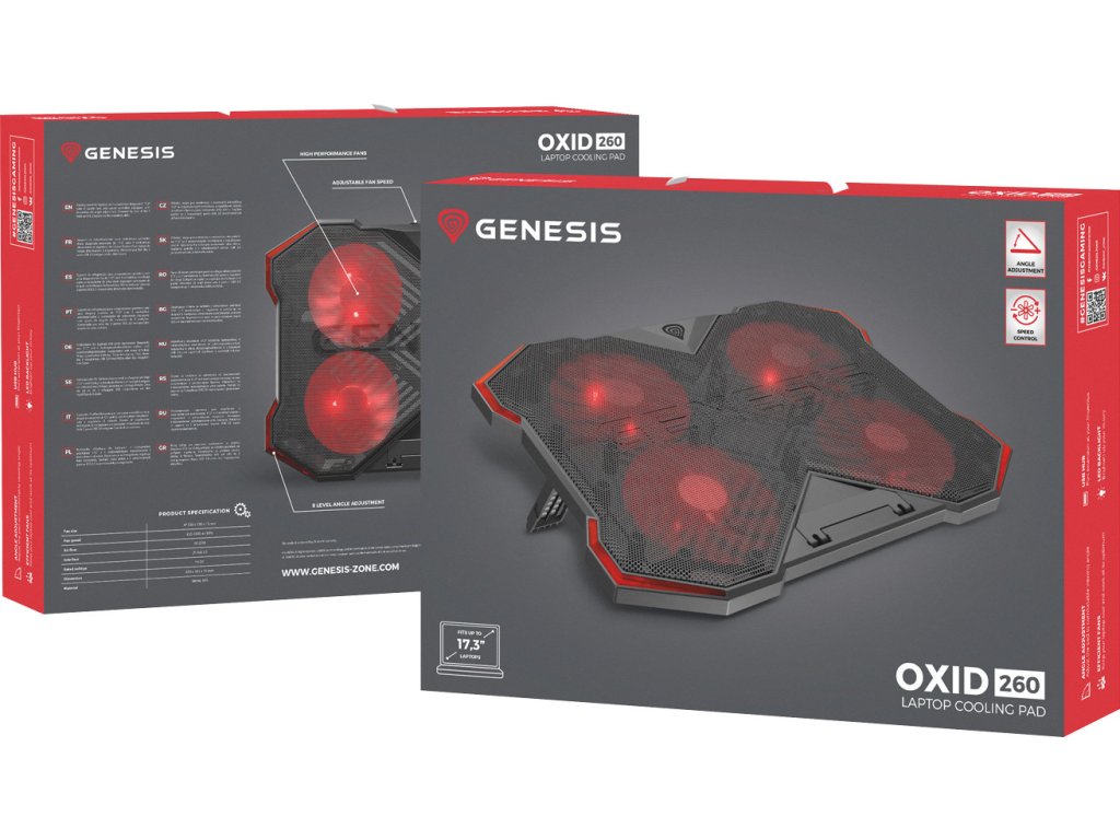 Genesis Oxid 260 je určen pro notebooky s úhlopříčkou obrazovky až 17,3 palce. Kovový panel s perforací na přední straně zajišťuje účinnou cirkulaci vzduchu, zatímco gumová podpěra základny zajišťuje váš mobilní počítač, zabraňuje jeho klouzání po povrchu podložky a chrání jej před náhodnými pády.