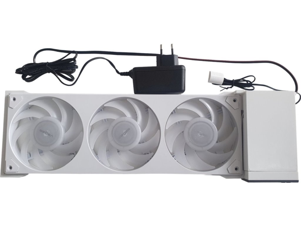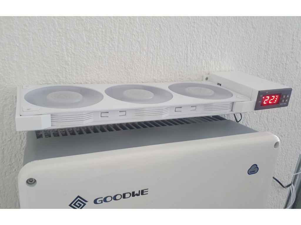 Velké 12cm ventilátory s dlouhou životnosti jsou vybaveny kvalitním dvojitým kuličkovým ložiskem, které snižuje tření, hluk a umožnuje hladší a efektivnější chod. Součástí je digitální termostat s možností nastavení rozmezí teplot (ON/OFF) se senzorem k připevnění na tělo střídače, který zautomatizuje ovládání ventilátorů. Spotřeba při zapnutých ventilátorech je 7 W. Toto přídavné chlazení umí u střídače snížit teplotu až o 40°C.