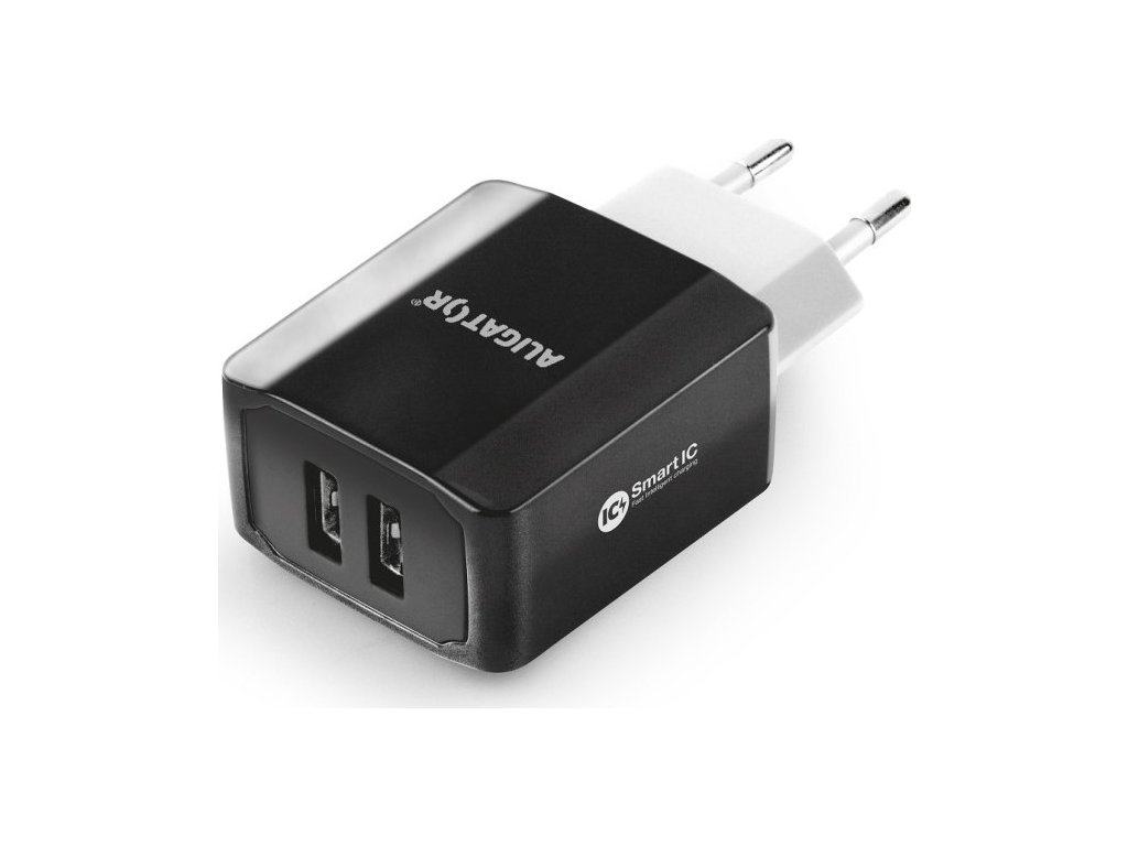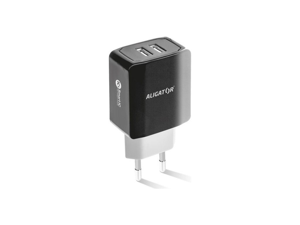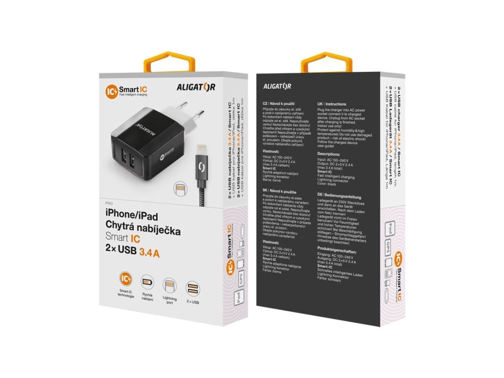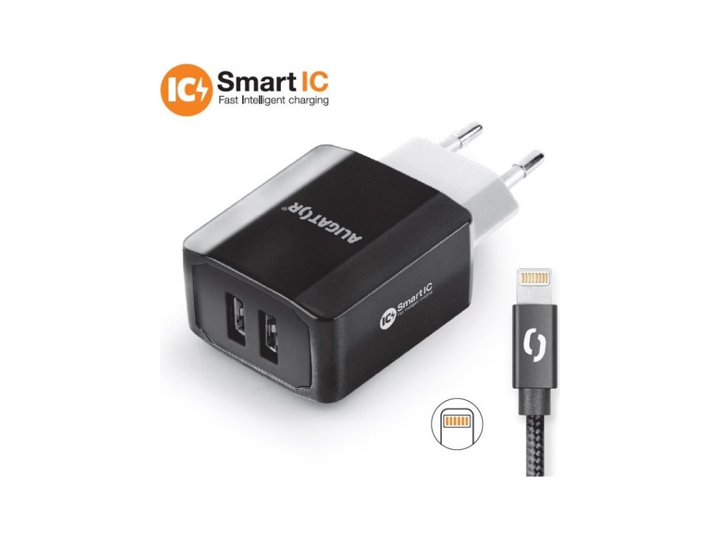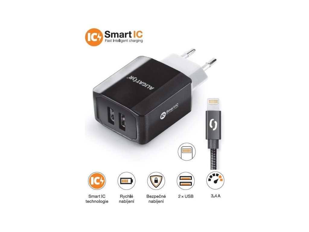 Chytrá síťová nabíječka ALIGATOR 3.4A, 2xUSB, smart IC, černá, kabel pro iPhone/iPad 2A