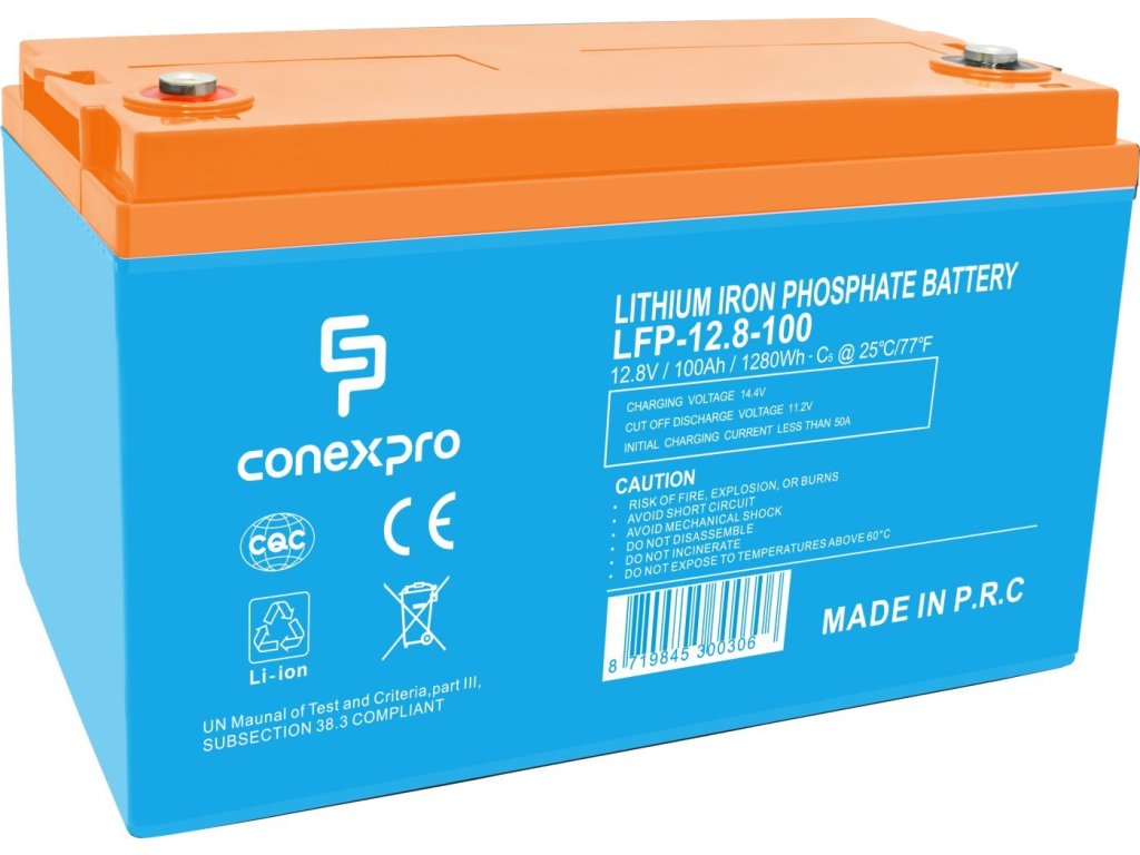 LiFePO4 baterie značky Conexpro s výstupním napětím 12,8 V, kapacitou 100 Ah (1280 Wh), až 5x delší životností než u olověné baterie, dvěmi M8 konektory pro připojení k zařízení a inteligentním Battery Management Systémem (BMS) pro řízení nabíjení a poskytování informací pomocí Bluetooth. Baterie této řady je vhodná pro celou řadu použití, od nasazení k pohonu lodí a člunů, jako trvanlivý zdroj energie v karavanech, jachtách, ostrovních fotovoltaických systémech, elektromobilitě nebo v prostředí s nízkými teplotami.
