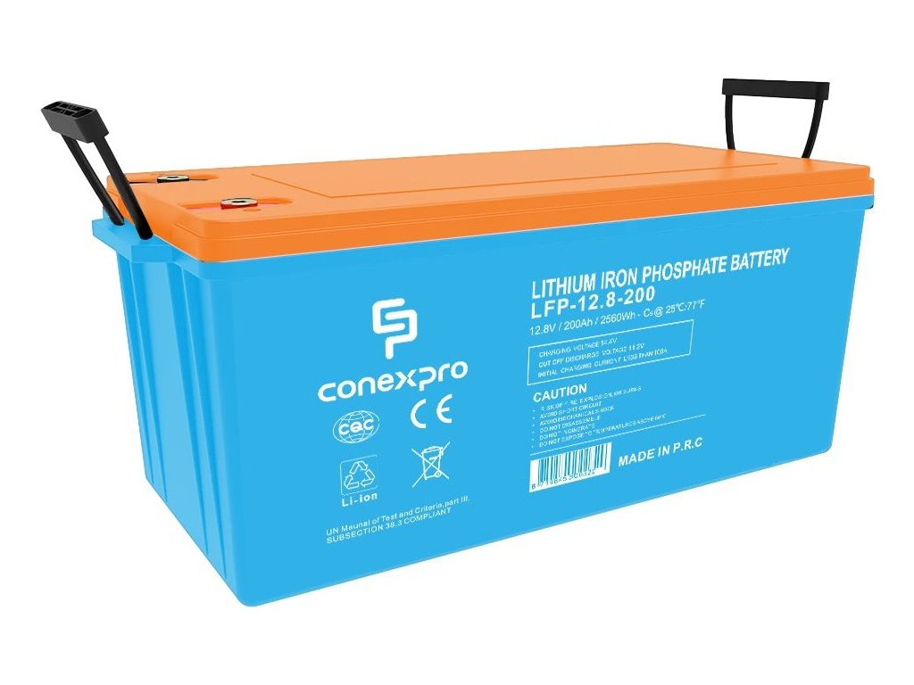 LiFePO4 baterie značky Conexpro s výstupním napětím 12,8 V, kapacitou 200 Ah (2560 Wh), až 5x delší životností než u olověné baterie, dvěmi M8 konektory pro připojení k zařízení a inteligentním Battery Management Systémem (BMS) pro řízení nabíjení a poskytování informací pomocí Bluetooth. Baterie této řady je vhodná pro celou řadu použití, od nasazení k pohonu lodí a člunů, jako trvanlivý zdroj energie v karavanech, jachtách, ostrovních fotovoltaických systémech, elektromobilitě nebo v prostředí s nízkými teplotami.