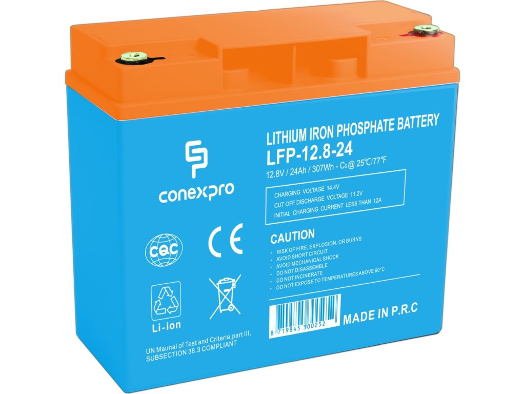 LiFePO4 baterie značky Conexpro s výstupním napětím 12,8 V, kapacitou 24 Ah (307 Wh), až 5x delší životností než u olověné baterie, dvěmi M5 konektory pro připojení k zařízení a inteligentním Battery Management Systémem (BMS) pro řízení nabíjení a poskytování informací pomocí Bluetooth. Baterie této řady je vhodná pro celou řadu použití, od nasazení k pohonu lodí a člunů, jako trvanlivý zdroj energie v karavanech, jachtách, ostrovních fotovoltaických systémech, elektromobilitě nebo v prostředí s nízkými teplotami.