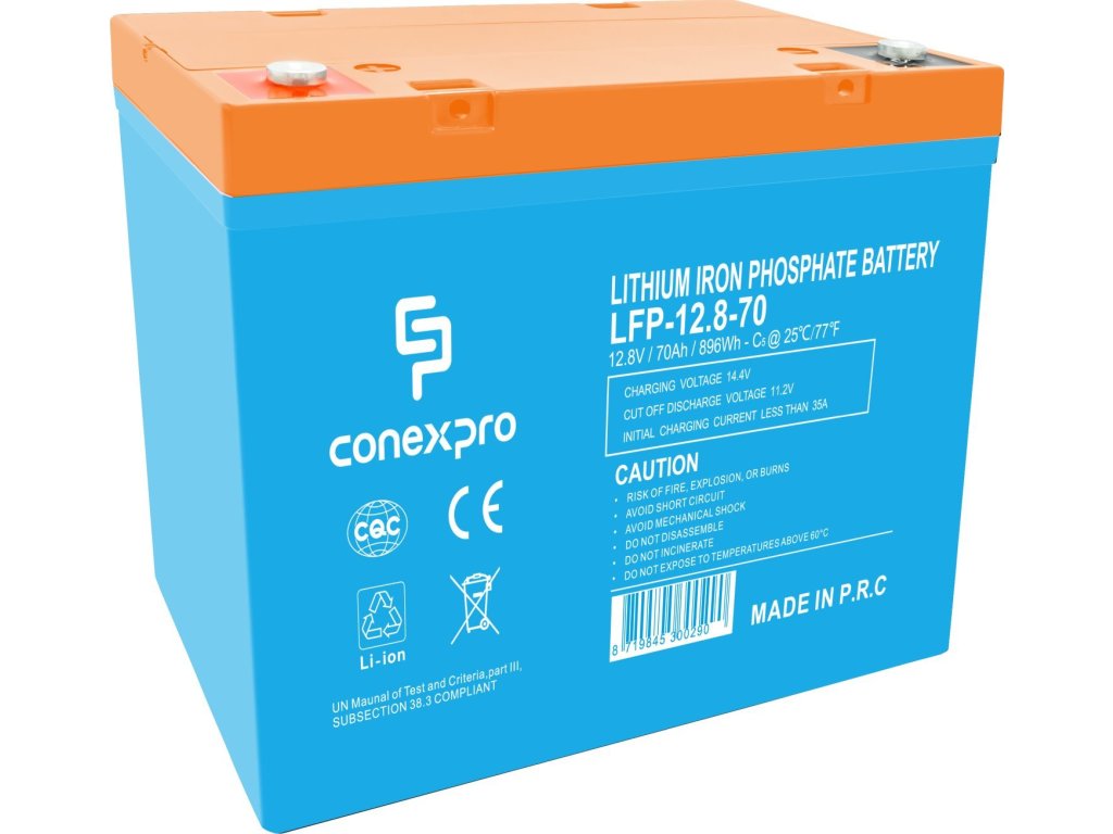 LiFePO4 baterie značky Conexpro s výstupním napětím 12,8 V, kapacitou 70 Ah (896 Wh), až 5x delší životností než u olověné baterie, dvěmi M8 konektory pro připojení k zařízení a inteligentním Battery Management Systémem (BMS) pro řízení nabíjení a poskytování informací pomocí Bluetooth. Baterie této řady je vhodná pro celou řadu použití, od nasazení k pohonu lodí a člunů, jako trvanlivý zdroj energie v karavanech, jachtách, ostrovních fotovoltaických systémech, elektromobilitě nebo v prostředí s nízkými teplotami.