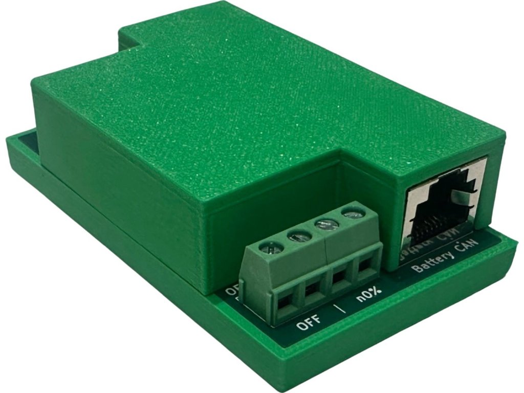 - Zařízení se zapojuje do portu BMS v měniči. Komunikační kabel od baterie se připojuje do tohoto převodníku, sběrnice CAN je skrz průchozí. Pro připojení do měniče použijte 8 žilový patch cord. Napájení převodníku se zajišťuje ze svorek 7 a 8 pravé svorkovnice měniče (12 V). Po zapojení napájení se rozsvítí led vedle napájecí svorkovnice.