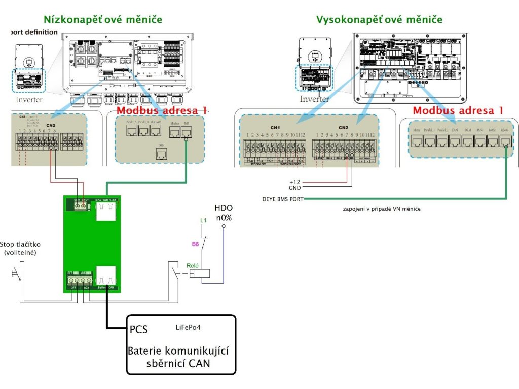 - Zařízení lze používat pouze s bateriemi komunikujícími přes CAN a hybridními měniči značky Deye.