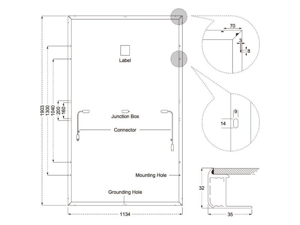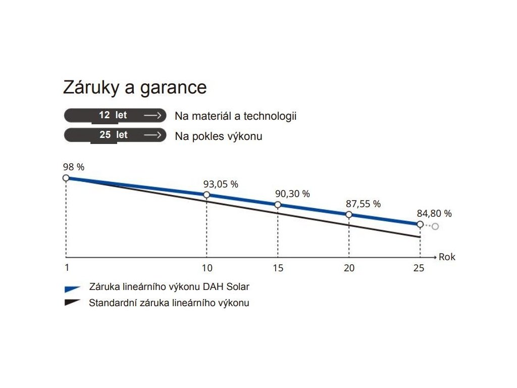 Solární panel značky DAH Solar s nominálním výstupním výkonem 455 W je složen celkově ze 180 monokrystalických článků a pevné hliníkové konstrukce v diskrétní černé barvě, která není z výšky vidět. Panel má na zadní straně pro připojení do měniče nebo vedlejšího panelu 2 výstupní kabely s MC4 konektory dlouhé 1,3 m, což je vhodné pro spojení panelů s vertikální i horizontální orientací. Celkové rozměry panelu jsou 1903 x 1134 x 32 mm, hmotnost 23,5 kg a účinnost 21,08 %.
