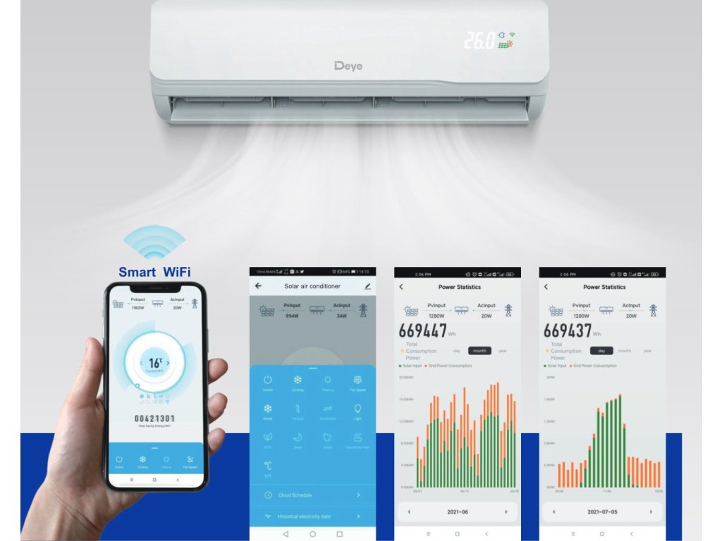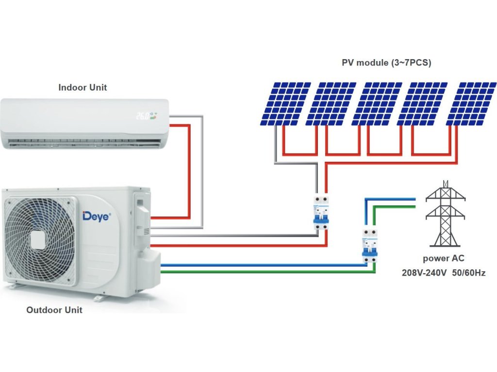 Moderní solární klimatizace značky DEYE kombinuje energii ze solárních panelů a elektrické sítě, což umožňuje energeticky úsporný provoz. V létě efektivně ochlazuje s výkonem 6100 až 27000 BTU, zatímco v zimě poskytuje vyhřívací výkon 1800–7200 W. S možností připojení 3–7 solárních panelů s MPPT napětím 80–380 V DC šetří 60 až 100 % energie oproti běžným jednotkám. Jednoduchá instalace, integrovaná Wi-Fi s mobilní aplikací a přehledné statistiky dělají z této jednotky ideální řešení pro domácnosti, které hledají ekologický a praktický způsob regulace teploty.