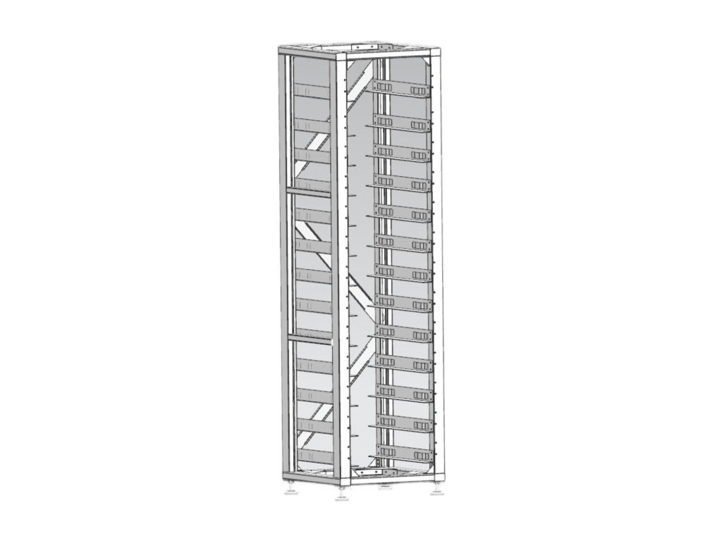 Racková volně stojící skříň o šířce 19", bez dveří a bočnic, od výrobce fotovoltaických systémů firmy DEYE je určená pro uložení vysokonapěťového bateriového clusteru, do kterého lze uložit až 12 baterií BOS-G a 1 BMS s označením HVB750V/100A-EU.