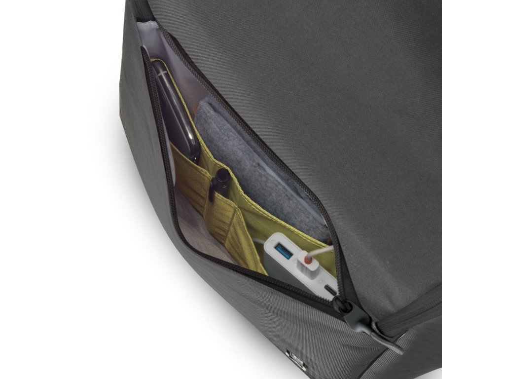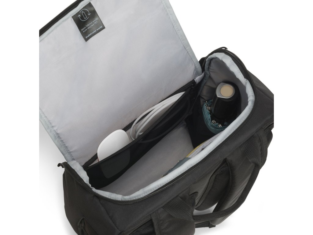 Batoh Eco MOTION nabízí ideální ochranu pro notebooky s úhlopříčkou 13 až 15,6" díky polstrování z pěny s vysokou hustotou (HDF). Zasouvací kapsa poskytuje spolehlivou ochranu tabletům do velikosti 12,9". Prostorná hlavní část je rozdělena tak, aby bylo možné dokumenty a příslušenství uložit odděleně. V síťovaných kapsách uvnitř brašny je místo na láhev s vodou nebo deštník. Přední kapsa má praktické menší přihrádky, takže si do ní můžete uspořádat menší předměty jako je smartphone, pera nebo nabíječky. Přídavný zip na boku batohu umožňuje rychlý přístup do hlavního prostoru. Můžete si tak zajistit, že budete mít vše potřebné vždy po ruce. Díky ergonomickému polstrování se batoh pohodlně nosí na zádech a polstrované ramenní popruhy lze pro větší pohodlí také nastavit. Batoh je vyroben z vodoodpudivého materiálu, který ochrání obsah i v deštivých dnech. Ekologický batoh MOTION je tedy ideální pro vás, pokud jste stále na cestách a chcete podpořit recyklaci PET lahví ekologickou taškou.