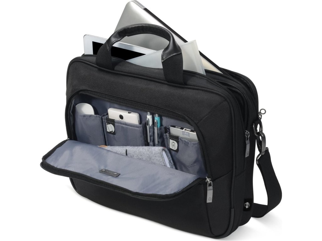 Vyrobeno z vysoce kvalitního recyklovaného PET bez kompromisů v kvalitě, funkčnosti nebo designu. Lehká a obzvláště nárazuvzdorná ochrana EVA nabízí špičkovou ochranu vašeho zařízení. V této prostorné a všestranné tašce, která nabízí chytrá úložná řešení, je také prostor pro tablet a příslušenství. Uzamykatelná přihrádka na notebook poskytuje dokonalou ochranu vašeho 14-15,6" zařízení s okolní výplní z pěny o vysoké hustotě (HDF) a perforovanou, lehkou rohovou výplní z EVA pěny. Tablet s úhlopříčkou až 12,9 palce lze také bezpečně uložit do polstrované kapsy. Prostorná přední kapsa vám pomůže uspořádat věci díky svému funkčnímu rozdělení na oddíly pro smartphone, přenosnou nabíječku, pera a další předměty. Další přední kapsa poskytuje prostor pro nabíječky a kabely. Dokumenty lze uložit do samostatného slotu na zadní straně tašky.