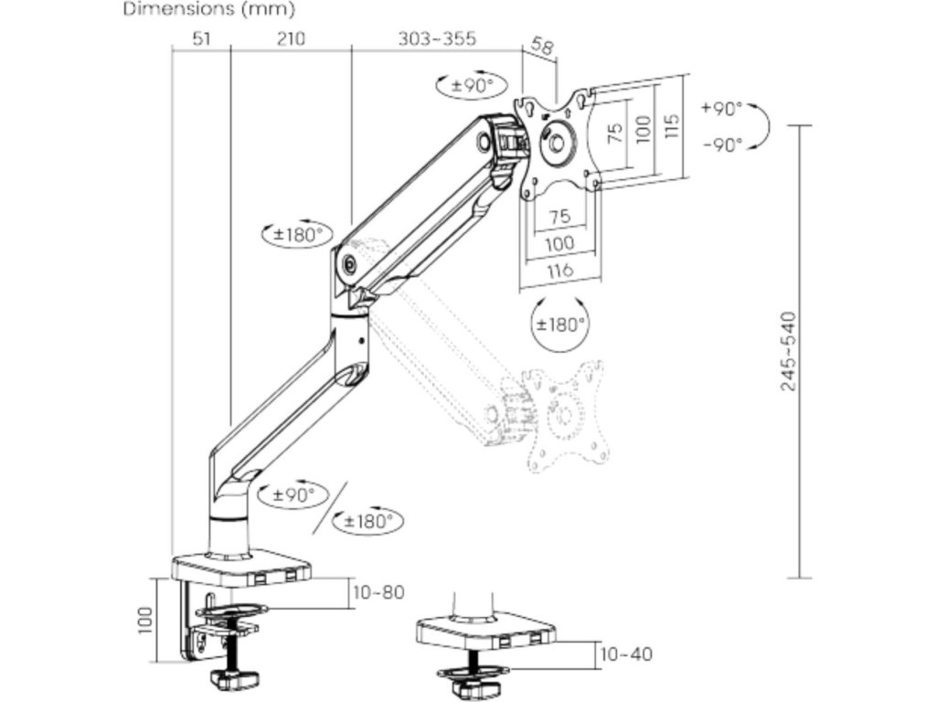 • Snadná instalace: Držák je dodáván s kompletním montážním příslušenstvím, díky němuž je možné ho snadno namontovat na stůl během několika minut. Snadná montáž pomocí svorky na desky o tloušťce 10-80 mm nebo pomocí průchodky na desky o tloušťce 10-40 mm.