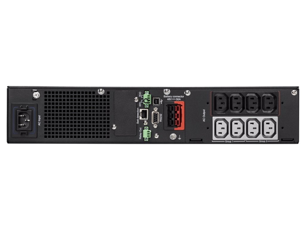 Komunikační porty: 1× USB-B, 1× sériový port RS-232, 1× svorkovnice pro dálkové zapínání/vypínání, 1× svorkovnice pro dálkové odstavení, 1× svorkovnice pro výstupní relé