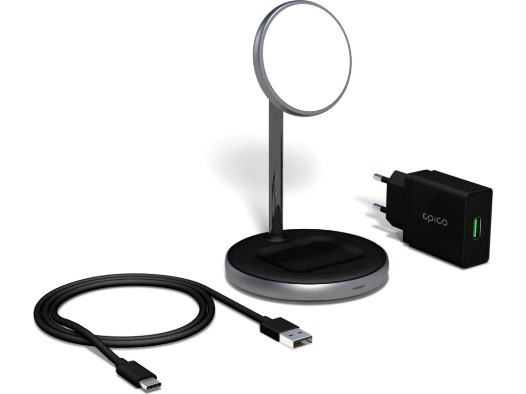 Epico 2in1 Magnetic Wireless Charger je magnetický stojan, který kombinuje funkci duálního bezdrátového nabíjení s prémiovým designem. Je kompatibilní s MagSafe a nabízí silné magnetické uchycení pro nepřerušované nabíjení. Dokáže nabíjet váš smartphone maximálním výkonem 15W (7,5W pro iPhone) a vaše AirPods výkonem až 5W. Slouží také jako praktický stojánek pro iPhone, který vám umožní sledovat videa nebo telefonovat v preferovaném úhlu. Díky LED indikátoru můžete kontrolovat stav nabíjení. Součástí balení je USB-C kabel a 18W QC síťový adaptér.