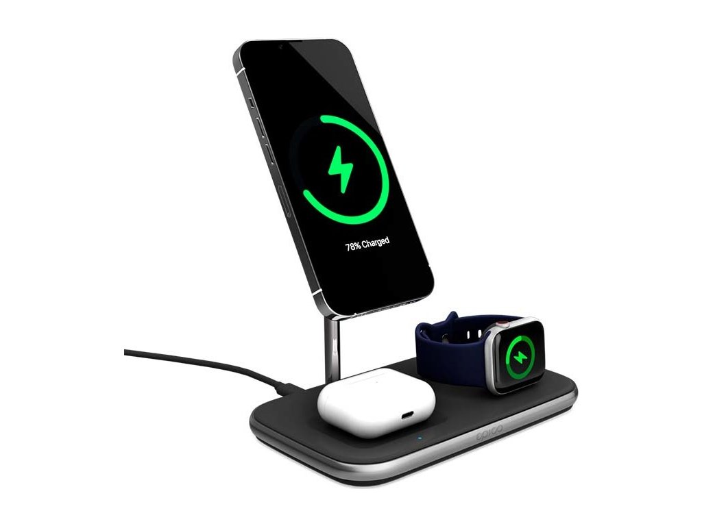 Epico 3in1 MagSafe Wireless Charger je magnetická nabíječka a stojan v jednom s MFi a exkluzivní Made for MagSafe certifikací, která zajišťuje 100% kompatibilitu s veškerými iOS aktualizacemi a zároveň nabíjí váš iPhone výkonem až 15 W. Nabíječka v sobě kombinuje výkonné funkce a prémiový a elegantní design - ideální řešením pro bezdrátové nabíjení až tří zařízení najednou zatímco doma odpočíváte nebo pracujete. Současně s vaším iPhonem můžete nabíjet i Apple Watch a Airpods. Díky silnému magnetu je smartphone bezpečně připevněn k nabíječce, takže můžete smartphone natočit do libovolného úhlu.